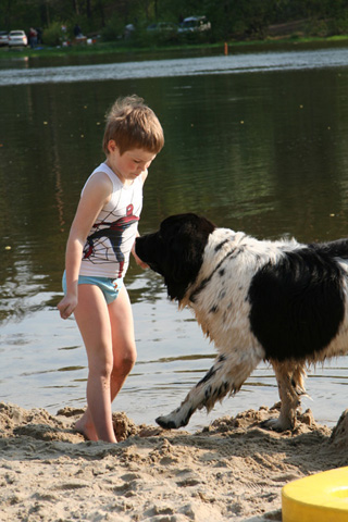 ксюша заранее, еще на берегу, заигрывает с собаками