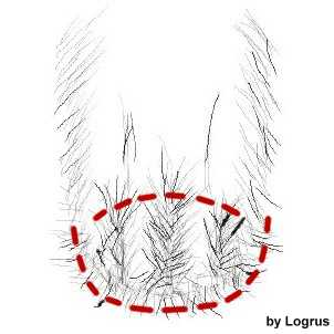 Подстрегите торчащие волосы сзади лапы, с внешней стороны и изнутри. Шерсть изнутри должна быть выстрежина в зависимости от ширины грудной клетки. Чем уже грудь, тем больше стригите, но не переусердствуйте!!!